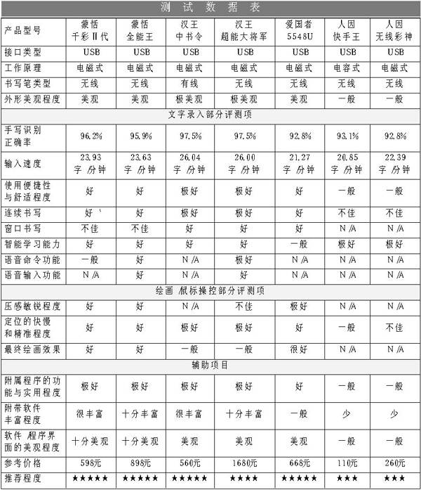 通过此次评测,我们也看到,随着技术的发展和提升,基本的汉字输入已经不再是什么大问题,1xx元的产品便能够搞定,而现在追求的是书写的舒适性、美观性和附加功能的丰富程度,在这方面,蒙恬、汉王等老品牌都有不错表现。汉王板的使用舒适程度和高识别率、蒙恬板丰富强大的软件功能都是业界的典范。而爱国者则在图形创作上下起了工夫。其他厂商则追求高性价比,在作好基础功能的前提下采用低价入市,可谓各有特色。不过大家也要注意到,很难有一款产品,包括业界领头羊的WACOM的产品,能够在文字识别、图像创作、辅助功能上都做得十全十美,所以大家在购买时,切忌有“通吃”的思想,想清主要用途,考虑自己的经济承受能力做理性决定。