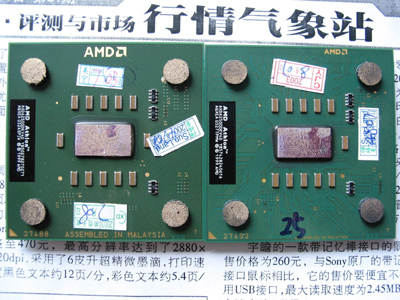 3种外观:一种XP 2500+是较早出现在市场上的,采用黄色基板,目前已经不多见。另外两种虽然都采用绿色基板,但仔细观察,外观还是存在差别,一种CPU基板上的布线清晰可见(图右),另一种则看不出来(图左),另外这两款CPU的“AMD”及产地标志的印刷方式也有所不同。