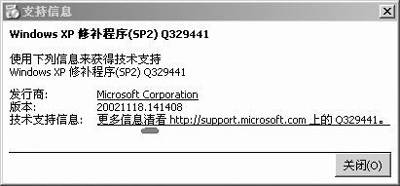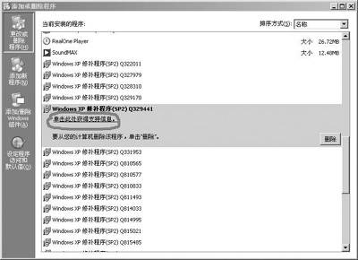 笔者使用的系统是Windows XP,在“控制面版”中打开“添加/删除程序”,在当前安装的程序列表框中有很多自动更新的Windows XP修补程序,点击某个修补程序,如果有“单击此处获得支持信息”的提示,请点击它,在接下来弹出的对话框中,你会发现只要包含有“更多信息清看……”这句话的,里面的“请看”均为“清看”。