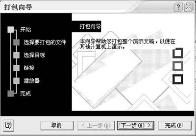 进入PowerPoint 2000/2002,选择“文件”菜单中的“打包”选项,会弹出“打包向导”窗口(图1);如果未安装该程序,则会弹出提示窗口:“这项功能目前尚未安装,是否现在安装?”选择“是”安装,安装过程就不多说了。