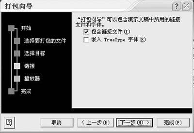 在“打包向导”操作窗口中,根据提示依次选择需要打包的演示文稿、打包后输出的路径;要是怕原来的字体被换掉,就选择将演示文稿中所用到的链接文件和嵌入TureType字体同时打包(图2);如果担心演示场所的电脑上未安装PowerPoint软件,就将播放器一起打包。选择好后单击“完成”,等候几秒就打包完了,这样你就可以将打包好的文件拷下来随时使用了(要记住,如果改动演示文稿还得再次运行“打包向导”)。