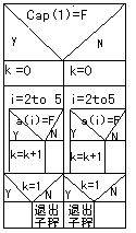 总共就只有三块,输入、输出和处理。我们可以将五个人用一数组Cap(1)~Cap(5)来表示,将cap()设成两个值,T代表红帽,F代表白帽。这样,我们只要输出Cap(1)~Cap(5)的值就行了。输出呢?我们用N-S图就可表示成图1。暂且如此。