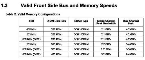 笔者查询了Intel 865系列芯片组的内存设置指南的白皮书,发现Intel虽然没有指明DDR333内存在800MHz前端总线下的分频状态,但是却指明了内存的传输速率为320MT/s(DDR内存在一个周期内会有两次数据传输,所以数据传输率就是内存频率的两倍,320MT/s就是表示内存实际运行在160MHz),内存带宽为2.65GB/s(如图),比标准DDR333的2.7GB/s稍低一些。通过内存带宽也可以推算出内存运行在160MHz上,也就是DDR320。
