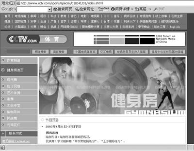 对于许多人来说,每天早晨打开电视机随着CCTV—5的“健身房”节目开始一天的生活,已经成为了一种愉快的习惯。可是,上班族却不容易享受到这清晨的“健身房”。别着急,来“CCTV—体育频道—健身房”(http://www.cctv.com/sports/special/c10141/01/index.shtml)吧,无论是瑜珈形体、太极学堂、民族舞、云南花灯、现代舞、拉丁风情、艺术体操还是时尚流行的街舞,都有视频文件。随时随地,想运动,就运动!