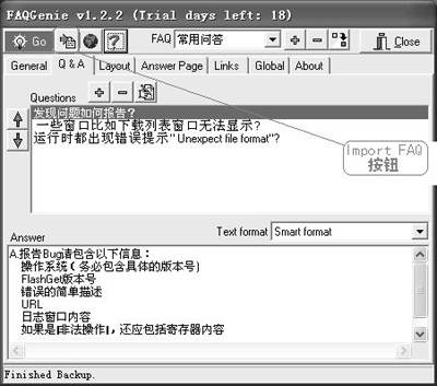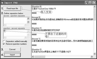 首先把该文本文件编辑一下,在每个问题后面加入一个“?”号,并把两个问题用空行隔开。然后点击主界面中的“Import FAQ”按钮(图1),进入输入界面(如图2),使用“Read input file”按钮把文本导入进来。接着在question-answer separator栏中输入“?”号(注意:这里的问号必须与文本中的保持一致,也就是说它们同为半角或全角),并把Remove question numbers项选中。最后只要依次点击“Convert”和“Import”按钮就可以完成添加了。