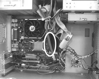 打开机箱盖后,与预想的一样,机箱内部整洁、紧凑。由于新蓝靓点4040电脑采用的是小主板。因此机箱的整体体积也有了缩减,使得整个机箱看起来并不是很大。可以有效地节省占地空间。最令编辑感到意外的是新蓝靓点4040电脑所选用的硬盘。正当编辑觉得这台新蓝靓点4040电脑一切设计都很常规时,编辑看到了它的硬盘数据线,该数据线并不是普通的IDE数据线,而是非常细的串行ATA数据线(图2)。