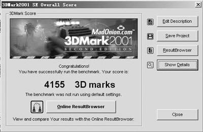 在这部分的测试中,主要是考查新蓝靓点4040电脑的游戏性能以及该电脑对3D数据的处理能力。对于GF4 MX440 AGP 8×显卡来说,应付一般的3D游戏应该是小菜一碟。而我们的测试数据也证明了这一点。在3DMark2001SE的测试中,在分辨率为1024×768@32bit刷新率为85Hz的环境下,新蓝靓点4040电脑得到了4155分的成绩(图4)。在测试过程中,画面流畅,色彩分明。没有出现任何的贴图错误。