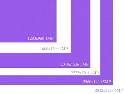 首先让我们看清楚低像素机型与高像素产品在成像大小上到底有多大的差别。比如300万像素DC所能拍摄的最大分辨率为2048×1536,500万像素所能拍摄的最大分辨率为2560×1920,这个差距明显吗?如图所示从300万提升到500万像素与从100万像素提升到300万,前者的图像面积大小提升只有后者的一半,同时我们也可以看出300万像素DC拍摄出来的图片其纵横比达到了500万像素的80%,从这两方面看来采用500万像素的DC其最终成像的大小与300万产品比较起来提升不大。