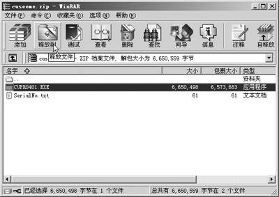 双击压缩文件,会弹出WinRAR窗口(图3),窗口中将列出压缩文件中的所有文件,你可直接点击工具栏中的“释放到”按钮将包中的全部文件解压,也可选择其中的一个或几个文件进行解压。