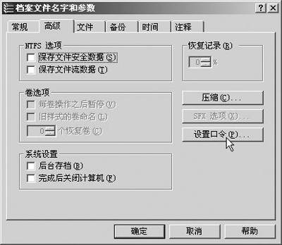 如果想为压缩文件加密可选择“高级”选项卡(图6),单击其中的“设置口令”按钮,然后在“带口令存档”对话框中设置口令。这样不知道密码的人是无法解压缩文件的,增强了文件的安全性。