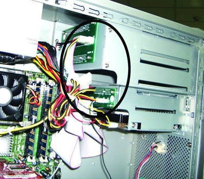 拆开机箱,我们看到机箱内部的数据线排列得简洁、有序。主板上印有白色的“Intel”字样,可以知道这是一款Intel原装的主板。机箱的结构很简单,没什么特别的地方,不过,在这台方正影音王8500HT电脑的光驱与软驱后部,我们却看到两个不同寻常的绿色电路板(图3)。而通常应该接在光驱与软驱的上的电源与数据线,却接在了这两块电路板上。原来方正影音王8500HT电脑的机箱在设计的时候,就在机箱内部设计了一个“光驱盒”与“软驱盒”。这样一来,光驱与软驱的安装就变得非常简单了。只要把光驱与软驱直接插入特殊设计的“光驱盒”与“软驱盒”内,安装就算完成了。真的是非常人性化的设计。这样的安装方式很像服务器上即插即用的SCSI硬盘。显得非常酷。并且这样的设计,省去了数据线与电源线的频繁插拔。延长了数据线的寿命,减少了电源线插头接触不良而引起的故障可能性。