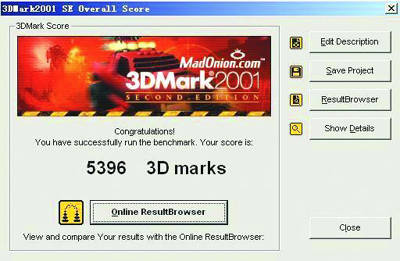 既然这台方正影音王8500HT电脑号称是影音王,那它的音响与画面效果应该比较出众的了。我们就用3DMark2001SE来测试这台机器的游戏速度。对于Radeon 9200显卡来说,普通游戏应该不是什么问题吧。一起来看看测试数据:在分辨率为1024×768@32bit,刷新率为85Hz的环境下,方正影音王8500HT电脑得到了5396分(图6),比相同配置下的GF4 MX440显卡得分多了1000多分。画面没有任何贴图错误。