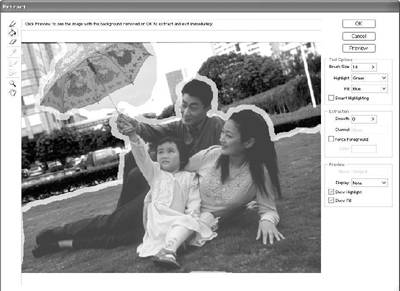 1.在Photoshop中打开人物图片,然后点菜单“滤镜→抽出”,在弹出的窗口中选择工具面板的画笔工具,在右边的设置区设置笔头的大小为“15”。参考图2,画出闭合的选区。然后用工具面板的油漆桶工具填充。最后点“确定”结束。