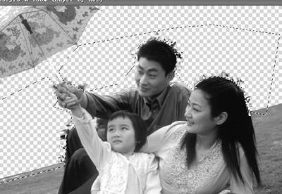 注意:被填充的地方是保留的部分,没有填充的将删除。如果你的选区不能填充,那是没有闭合的原因。在勾选时我们保留了草坪的部分,这是因为草坪的部分在后面还有用。其中雨伞与背景建筑相接的部分我们勾选得很仔细,而与天空相接的一边我们没有勾选,这是由于没被勾选的部分色彩单一,用魔术棒工具就可选取了,这里就不用浪费时间了。