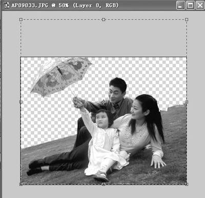 1.要将残缺的太阳伞修补完整,首先要拓展画布上面的空间。点工具面板中的放大工具,按住键盘上的Alt键,将画布缩小到50%。然后点工具面板中的剪裁工具,将画布中的范围全部选取,用鼠标按住最上边当中的结点向上拉出画布以外(图4),最后双击鼠标,现在看原照片的空间是不是被拓宽了?