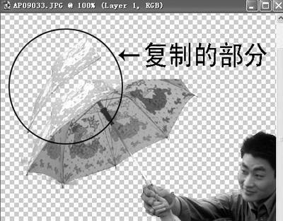 2.经过第一步的处理,我们可以看到还有很多细节的部分不够完善,先用魔术棒选取工具将天空与伞相接的背景选取,然后按键盘上的Delete键将它删除。然后用直线选取工具将细节的部分选取,删除多余的部分(图3)。