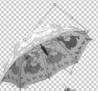 3.点菜单:“编辑→改变→水平翻转”,然后按键盘上的“Ctrl+T”,将复制的部分做灵活的调整,使太阳伞的另一只角完整(图6)。注意图6中对复制部分的方向及透视的调整,使之看上去十分完整。