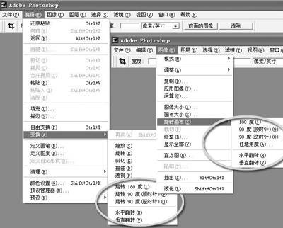 水平翻转的使用:在Photoshop的菜单中有两个命令设置有点相似(图8),一个是编辑菜单中的变换下的命令,一个是图像菜单中的旋转画布下的命令。这两条命令让许多人混淆。编辑菜单中的旋转与水平翻转是对一个图层作用(只针对一个图层)。而图像菜单中的旋转与翻转是对整个画布作用(包括所有图层),两条命令功用是有明显的区别。
