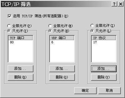 打开“控制面板”,双击“网络连接”,右击“本地连接”,选择“属性”,在“本地连接属性”窗口中,选择“Internet”协议,点击“高级”按钮,然后在“高级TCP/IP设置”窗口中选择“选项”选项卡,双击“TCP/IP筛选”即可进入设置窗口(图2))。选择“只允许”,则用户只能使用设定的端口,这样就可以达到禁用危险端口的目的。一般而言,如果我们的计算机只是工作站而不是服务器,就可以只开放如下端口:TCP:80,UDP:6,IP协议:17。