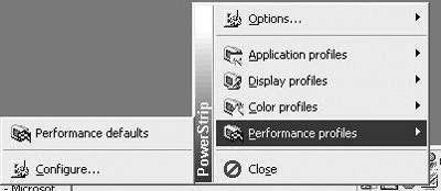 在任务栏中,你会发现出现了一个显示器似的小图标,单击该图标,选择“Performance Profiles→Configure”(如图4)打开该窗口(如图5)。用鼠标向上拖曳“Clock controls”滑动块,就可以增大显存频率、显示核心频率。当对显卡进行超频时,发生超频过度引起屏幕抖动、倾斜现象时,可以等几秒钟待它自动恢复,或使用设置的快捷键“Ctrl+Alt+S”返回该显卡的安全设置!