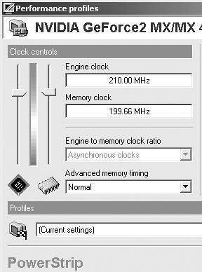 PowerStrip(下载地址为http://file2.mydrivers.com/tools/display/powerstrip3.45.exe)几乎支持所有的优秀显卡超频。现在的显卡大多数都在内部集成了可编程的PLL电路(锁相环电路,它能使受控振荡器频率和相位均与输入信号保持确定关系)),而PowerStrip就是通过改变PLL电路来改变显卡的工作频率,从而提高显卡的工作效率!通过PowerStrip我们可以很方便地调节显卡的核心、显存频率!