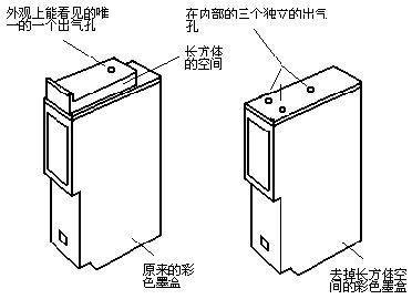 笔者在第一次灌墨时,由于不清楚墨盒内的墨使用了多少以及此墨盒所能容纳的墨水量的多少就进行灌注,于是灌注的蓝色墨水过多而造成蓝色墨水回流入红、黄色墨水中,导致混墨。随后笔者在对佳能BCL-24墨盒进行拆卸后发现,混墨与佳能BCL-24墨盒的设计有十分重要的关系。在墨盒的内部,3块海绵所处的空间和其上方的3个出气孔都是独立的(图1右侧),而在我们手中所看到的佳能BCL-24墨盒上方的出气孔只有一个(图1左侧),又因为在灌墨的过程中墨盒是倒放的,所灌的多出来的墨就会分别通过3个独立的出气孔进入墨盒顶端的那个长方体的空间(图1右侧),然而在我们完成灌墨操作后,我们不会知道在墨盒中那个长方体的空间里已经驻留了我们灌多出来的墨水(最多会有一点墨水从我们所能看见的墨盒上方的那一个出气孔中流出,大多数人只是将流出的墨擦去罢了)。随后,我们就会将墨盒放入自己的打印机中,认为大功告成。其实,留在长方体中的墨就会顺着我们看不见的那3个出气孔分别流入红、黄、蓝色的海绵中,引起混色。一般混色现象在打印机使用一段时间后才会出现,因为混合的墨水是从上往下的,污染整块海绵需要一定的时间。