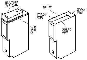我想既然如此,那就把墨盒拆了,反正也“没用”了,说不定还能找到解决的办法呢!于是,我找来小刀(或用一些较尖锐的器具),沿着墨盒上方的一条缝将墨盒顶部的大盖子切开(图2左侧)(注意:切的时候不要把整块盖子全部切断,只需要把盖子一圈的塑料切开,然后用起子把盖子撬开即可)。切开后可以看到红、黄、蓝3块海绵整齐地挤压在墨盒内(图2右侧)。然后,就可用一些表面较平整的器具从墨盒的下部自下而上地分别将红、黄、蓝色的海绵逐个顶出(注意:顶出的大块海绵下面还有一块小海绵,要保存好)。随后,把海绵和墨盒分别在水里清洗(清洗时最好戴上塑料手套)。墨盒顶部的大盖子也要放在水里认真清洗,将里面多余的墨水除去,以免墨盒洗好后又重新造成污染!洗净后将海绵用吸水纸吸干,按原来的位置装好,这时就可以从上面向海绵内滴入墨水,这次可不能滴多了(大概140~160滴即可)!最后将那个大盖子盖上,用胶带将它与墨盒绑紧(注意:不要把出气孔堵上),清洗工作完成。这时还不能急着把墨盒装入打印机内,下面要做的是让打印机在无墨盒的情况下空打一些彩色图像,把打印机内剩余的残墨打完。打完残墨后就可把墨盒装入打印机内。打几张照片试试吧!开始可能会出现断墨的现象,打一会就正常了。