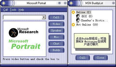 点击右下角的“Buddy”按钮后,你就可以在右侧的“MSN BuddyList”窗口中选择MSN Messenger的在线用户进行聊天。同样,在MSN Messenger中,你也可以执行菜单“操作→启动Microsoft Portrait”来打开Portrait。
