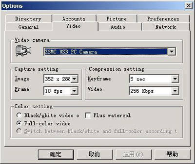 切换到“Video”选项页面,“Color setting”一项,对于使用Modem拨号上网的朋友,推荐选择“Black/white video only”(黑白);速率在56Kbps~128Kbps的朋友推荐选择“Switch between black/white and full-color according to bandwidth”(在黑白与全彩之间切换);宽带上网的朋友则推荐选择“Full-color video only”(全彩)。