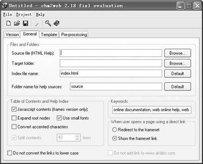 2.点击“General”标签,在“Source file(HTML Help)”下输入要编辑的CHM电子书的保存路径,并使用“Target folder”设定生成网页的保存文件夹,然后在“Index file name”和“Folder name for help source”项下分别输入索引文件的名称以及电子书变成网页后存放的文件夹名称。另外,还可以在下面对是否使用小字体(Use small fonts)、使用何种网页关键字(Keywords)等进行设定(如图)。