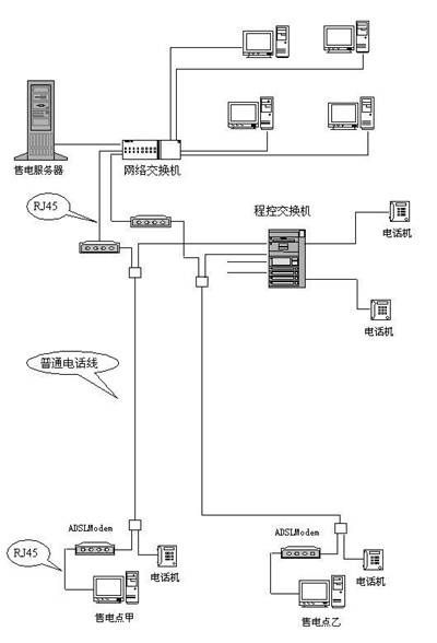 在售电点甲、售电点乙,只要用ADSL方式连接到Internet,再拨叫售电服务器的VPN服务器。连接之后,售电点甲、售电点乙、售电服务器将组成一个局域网,可解决问题。