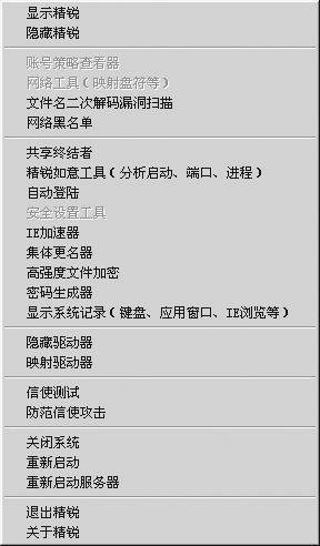 程序的安装非常简单,只要双击压缩包中的Setup.exe文件,然后按照提示即可完成。安装完毕后,桌面上会出现其图标,双击它,软件即可运行。此时,屏幕右下角会有一把钥匙形状的图标,用鼠标右击该图标,会弹出软件的主界面──系统菜单(图1)。严格来讲,精锐V3.6应该算是一套系统安全工具集,它主要包括以下组件: