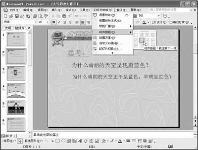 PowerPoint的交互功能相对于其他两款制作软件来说,显得偏弱。但PowerPoint简单易用,适合所有教师,同时涵盖的领域广,像教育、商务等课堂、会议场所都可见其身影。有些读者以为它只能制作直线型课件,其实不然,在PowerPoint(本文均以PowerPoint 2002为例)中同样可以通过插入按钮、对象与超级链接等创作出适用的交互式课件。