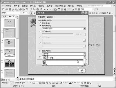 1)在PowerPoint中自带了动作按钮,利用它可以让我们轻松完成按钮交互设计。制作时首先在幻灯片栏选中准备制作交互的幻灯片,接下来在菜单栏单击“幻灯片放映→动作按钮”,从下级按钮选择框中选择需要的按钮,如“前进或下一页”(如图1),然后在编辑区幻灯片上按下鼠标左键,拖动鼠标绘制出按钮后,松开鼠标左键便可打开动作设置窗口。如果要设置单击此按钮时的声音,可勾选“播放声音”项,并在其下单击向下按钮选择需要的声音效果(如图2)。因为我们要使单击该钮后跳转到下一页,因此对于其他项可不再修改,单击“确定”按钮完成动作设置。