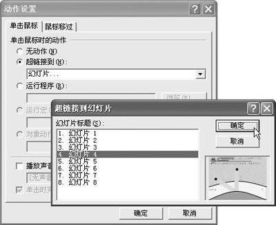 2)接下来再次单击菜单栏“幻灯片放映→动作”按钮,从下级选择栏中再选择一个按钮(建议不要使用已有的按钮形式,以便在使用操作时区分),如选择“动作按钮:结束”,同样再在幻灯片上拖绘出相应形状的按钮,并在弹出的“动作设置”窗口中的“超链接到”栏中选择“幻灯片”,然后在弹出的“链接到幻灯片”窗口中选择需要链接的幻灯片(如图3),完成后单击“确定”完成设置。接下来利用鼠标的拖动调整好按钮的位置及大小。