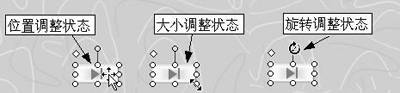提示:选择超链接到幻灯片时,在“超链接到幻灯片”窗右下端会显示该幻灯片的预览图。按钮的大小及位置的调整方法:先在要移动的按钮上单击选中,然后把指针移至按钮边沿的圆控点上,待指针形状变成双箭头时按住鼠标左键拖动便可调整大小。而位置调整可把指针移至该按钮上(指针形状变成十字箭头),按下鼠标左键进行拖动即可。另外把指针移至按钮上端的绿色圆控点,按住鼠标左键拖动还可对按钮进行旋转(如图4)。