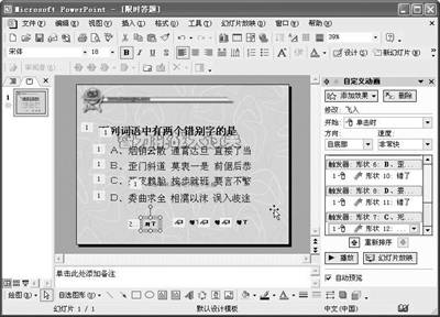 2.利用文本框输入问题及答题选项,调整好位置及字体大小、颜色等;然后选择新输入的多个文本框,再单击“添加效果→进入→出现”。完成后再选择提示文本框,输入文字“错”(例如选择题中A、B、D为错,那么这个课件在学生单击A、B、D三项任一一项时,都会出现“错误”的提示)。同样再添加一个进入的效果,如“飞入”,接下来在右栏中该效果选项上单击鼠标右键,在弹出菜单中选择“效果选项”,然后在新打开的飞入窗口中选择“计时”标签,单击“触发器”按钮,在其下勾选“单击下列对象时启动效果”,并从中选择一个触发器,如“形状5:A、烟销云散”(如图8),其他提示项也按此方法完成设置。在设置动画效果时建议不要太花哨,同时不要过多地设置动画声音效果,以免分散学生的注意力;完成后界面效果如图9。