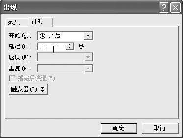3.接下来我们来实现限时的关键制作。单击菜单栏“插入→图片→来自文件”,然后挑选一张准备好的图片插入,并把指针移至插入的图片边缘的控制点上。指针变成双箭头时按下鼠标左键,拖动鼠标调整好图片的大小,如正好充满整个幻灯片,然后再单击右栏“添加效果→进入”(再在其下任选一种,如“出现”),最后在对应效果选项上单击鼠标右键,在弹出菜单中选择“计时”。在打开窗口中的“开始”栏选择“之后”,并在延迟栏设置延迟的时间,如“20”秒(如图10),最后单击“确定”便可完成所有设置。接下来单击菜单栏“幻灯片放映→观看放映”(或者直接在键盘上按F5键)便可观看到利用时间制作完成的交互效果。