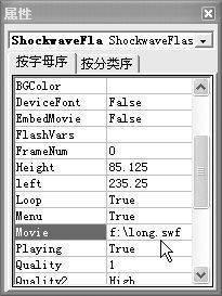 Flash是一款非常不错的动画及多媒体制作软件,由于其作品体积小,对计算机要求不高,因此在教师教学中,有很多动画或交互功能可以利用它来制作实现。而在PowerPoint中,也可适当添加一些Flash影片。为了不破坏Flash影片的交互功能,则可采用这种方式添加:先在PowerPoint工具栏空白处单击鼠标右键,在弹出菜单中单击“控件工具箱”,然后在打开的控件工具箱中单击“其他控件”,并在控件选择窗口中拖动垂直滚动条,选择“Shockwave Flash Object”(如图13),随后用鼠标(此时指针形状为“十”字形)在页面上拖出一个方形区域,该区域大小即要插入的Flash影片大小,可以把指针移至方形区域周围的控点上(此时指针形状变为双箭头)按住鼠标左键进行拖动调整。然后单击控件工具箱左上角的“属性”按钮(或者直接在方形区域上单击鼠标右键,在弹出菜单中选择“属性”),在打开的属性对话框中找到“Movie”一项,并在其后的栏内输入Flash影片所在的路径及完整文件名(该路径还可为网址)(如图14),完成后播放幻灯片便可看到Flash的交互效果不损丝毫地在PowerPoint中出现。