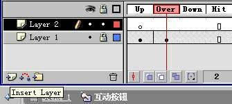 在时间轴右下边的组件框内选择“互动按钮”(图2),进入“互动按钮”组件的编辑画面。在第1层上单击小锁图标进行锁定,然后单击“Insert Layer”创建一个新层(第2层,见图3),接下来在图层“Layer 2”的“Over”和“Down”帧上再分别插入一个关键帧;回到“Over”帧,并将图库里的“Symbol 2”组件拖入场景(图4)。