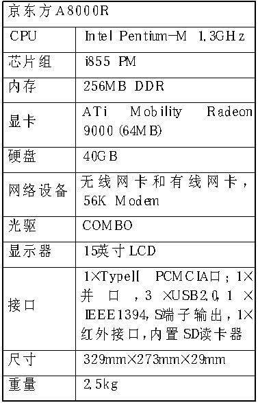 京东方A8000R采用带有64MB独立显存的ATi Mobility Radeon 9000独立显卡,是现阶段功能较强的显卡。加上15英寸的显示屏,使得A8000R的影像输出功能较好。除了超强的显示功能外,京东方A8000R还采用了Intel 最新的迅驰移动计算技术。CPU采用Intel Pentium-M 1.3GHz,采用了256MB DDR内存。另外配备了康宝光驱,可以轻松地刻录和DVD播放。