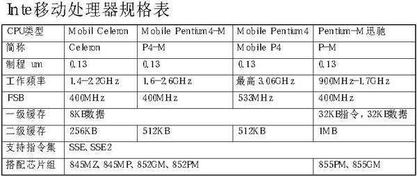 在PentiumⅢ以前,移动处理器的分类非常清楚。只要在桌面CPU后面加上“M”就行了,进入Pentium4时代以后,Intel的移动处理器分类就比较烦杂了,常常让人迷惘。我们特地整理了一个表格,供你比较、参考。这次评测我们收到的笔记本电脑全部采用Intel的处理器,而且迅驰机型是非迅驰机型的一倍多,这表明笔记本电脑厂商都力图借迅驰之势,占领更大的市场份额。