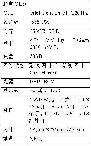 在配置上,CL50笔记本电脑采用Pentium-M 1.3GHz处理器, 8×DVD-ROM、搭配64MB独立显存的Mobility Radeon 9000显卡,以及40GB大容量的硬盘,同时配置了多个USB和IEEE1394设备接口。CL50的键盘和状态显示部分设计很有特色。它的按键采用半透明塑料制造,键盘区上端是电脑开关及两个快捷键,在触摸屏的旁边是电源和无线网络等状态指示灯。