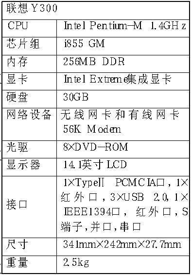 在配置上,因为是迅驰笔记本电脑,Y300采用Pentium-M 1.4GHz和i855GM芯片组,集成Intel Extreme显卡,内置8×DVDROM。送测机型的硬盘为25GB。