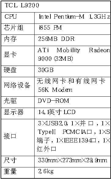 TCL L9200笔记本电脑采用Pentium-M 1.3GHz处理器,256MB内存,集成显卡。它的另一大特点就是在液晶屏正上方配备了一个摄像头(也有一种配置是不带摄像头的)。这种设计在索尼的笔记本电脑上曾经出现过,不过其他型号配备摄像头的产品还不是很多,这也是L9200的一个卖点。