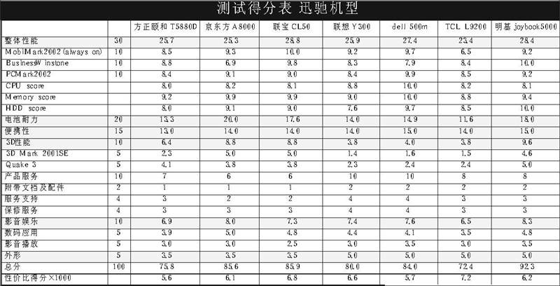 本次评分采用如下方式:每项测试中得分最高者计为满分,其他笔记本电脑该项测试软件得分除以最高分然后乘以满分得到实际得分。例如:A在某项测试中得分最高,为1000分,而分配给该项测试的总分为10分,那么A在这项测试中得到10分满分,而B获得800分,按照评分标准,B应该得到800/1000×10=8分。PCMark的得分也用类似的方法处理,CPU、内存、硬盘子系统分开计算,再计算成总分。每组得分最高的笔记本电脑获得编辑推荐奖,再用得分除以价格,比值最大的获得最佳性价比奖。