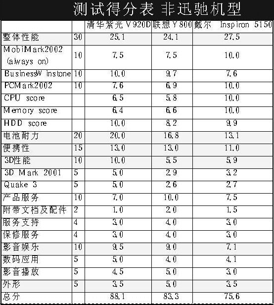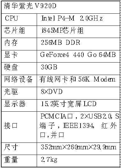 紫光V920D配置的是2.0GHz的Pentium4-M处理器,64MB DDR独立显存的GeForce4 440 Go显示核心,使得显示能力在非迅驰组机型的测试中遥遥领先。V920D配备6000mAh大容量锂电池,可保证连续3小时左右的电力供应。设计上有一个小的不足是USB接口和电源接口在一起,使用外接电源的时候,插拔USB鼠标或者闪存容易碰到电源线。另外紫光V920D在销售时没有预装Windows操作系统,而是预装的中文Linux。