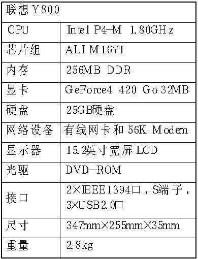 Y800的设计和制造颇具水准,铝合金外壳,珍珠白内部面板,浅蓝色透明键盘,与家居环境更加协调。因为是消费机型,Y800没有采用迅驰CPU,而采用的是Pentium4-M 1.8GHz处理器,搭配NVIDIA GeForce4 420 Go 32MB显示芯片,这样的配置在消费笔记本电脑中已经算是很高的了。