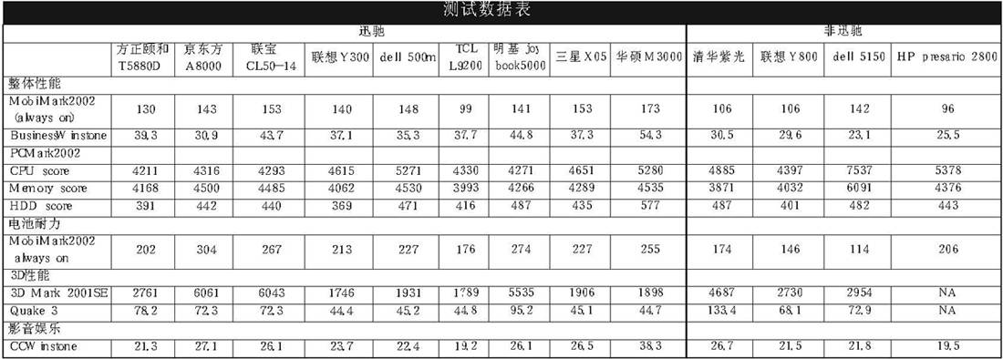 测试时所有的笔记本电脑均重新安装英文版Windows XP操作系统,并打上SP1补丁,硬盘格式化为NTFS格式,只设有C分区。除了电池测试,笔记本电脑均运行在全速状态下。考虑到短期内无线网络尚未普及,笔记本电脑的无线网络功能我们这次并未计入考量范围。另外有些厂商送来的机型价格超出了我们限定的范围,虽然我们也对它们进行了测试和介绍,但只是出于供读者参考的目的。