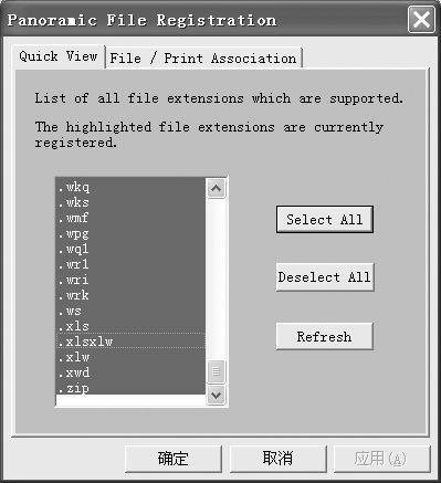 在缺省设置下,Panoramic是不支持ZIP格式的,不过我们可以从“Options→Configuration”中进行激活,点击“Registry”按钮,进入图4窗口,在“Quick View”选项页中,将“Select All”按钮选中,以后就可以顺利打开ZIP格式的文件了。